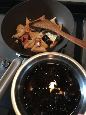 香菇洗净后水发切丝。注意香菇水不要倒掉了。豆腐切块,肉丝、蒜叶子、葱姜蒜都切好准备。