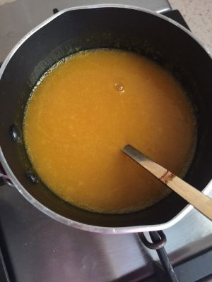 芒果200克打成泥,小锅加热,放入糖和用凉水泡软的吉利丁片,煮到糖和吉利丁完全融化