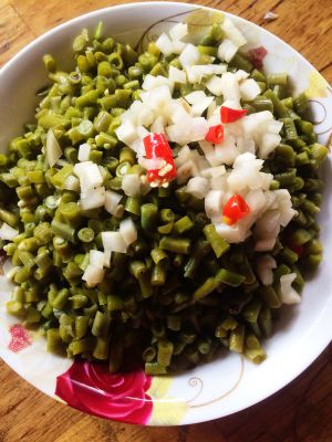 泡豇豆切成小丁,我还配了点泡辣椒和泡萝卜。可以增加些辣味。