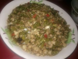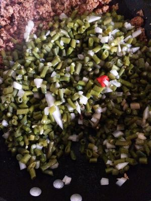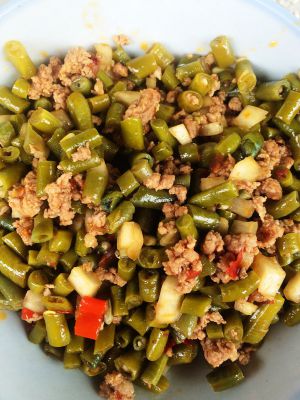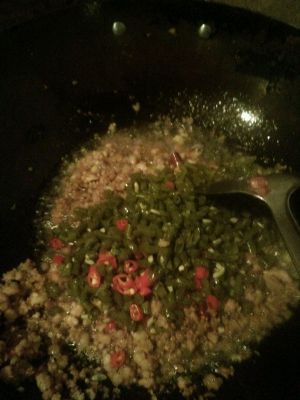 带肉沫变色加入酸豆角继续翻炒两分钟左右,放入鸡精,少许糖,就可以出锅了。