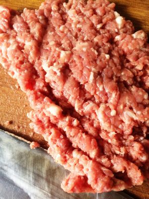 猪肉剁成肉泥。(分享一下我的剁肉小技能,手腕用力带动刀上下剁,而不是手臂用力,剁到用刀尖能很容易的剥离肉末了就基本可以了。)