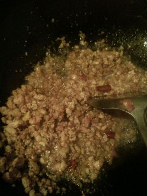 倒入肉末,开大火煸炒,尽量把肉末里的水分煸干些