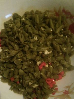 酸豆角配两个泡椒切成沫,(豆角是我自己泡的,想学的可以看上一个菜谱,自己泡的比较好吃,买的我做过一次不好吃)