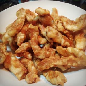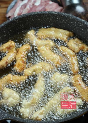 锅中油烧热,肉块裹上蛋液淀粉,下锅中小火炸第一遍定型。