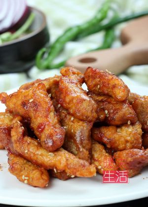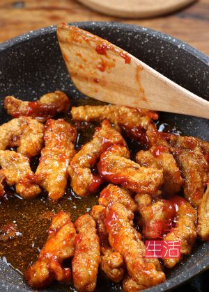 把油倒出,锅中留有少许底油,下番茄酱炒一会,把糖醋淀粉汁倒入锅中,当汁浓稠时把炸好的肉条倒入锅中快速翻炒把汁挂到肉条上即可出锅,有香菜可点缀一下为佳。