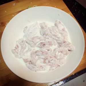 将里脊肉切成长条,加盐、鸡精、十三香、姜粉、料酒、淀粉、一个蛋清腌制一会儿。