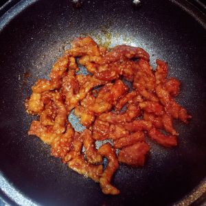 锅中加入底油,下入蒜末姜末爆香,下入炸好的肉块,倒入调好的酱汁,快速翻炒几下,让肉块均匀的粘上酱汁。