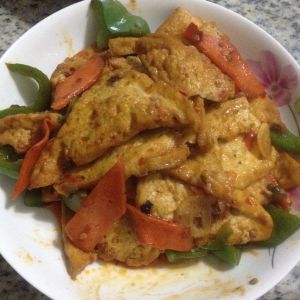 锅里煎豆腐的油不动,用它炒,先放干辣椒蒜粒呛锅