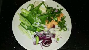 配材:拍扁蒜头,青辣椒圈,葱花,洋葱段,芹菜段,蒜苗段,杏鲍菇片,红萝卜片