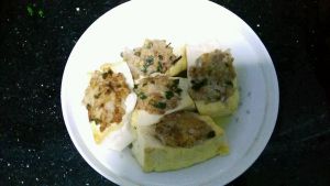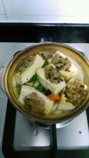 用砂锅起油锅,放入蒜头煲香后,将配材(除葱花,辣椒圈),倒入翻炒,将酿豆腐平在配材上,加水没过豆腐一半,盖上煮沸,此时要调至小火,以防糊底。