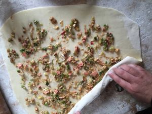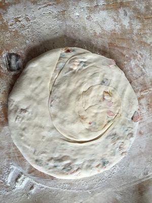把葱油料均匀铺在面皮上,不用太多。然后从一边卷起