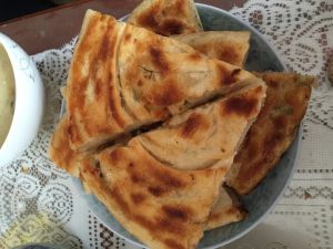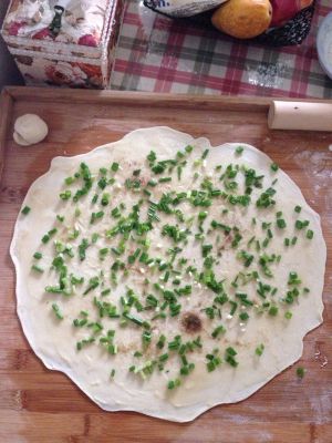 面皮多揉些时间,把皮擀的越薄越大越好,涂上熟油面粉搅拌的东西,用手更容易末的均匀,撒上葱和调料粉,不要撒太多。