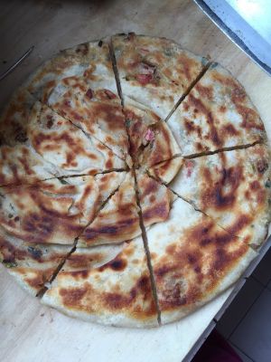 用手拍成这样的圆形,不要再用擀面杖来弄,容易把馅料挤出来,最后放入电饼铛中