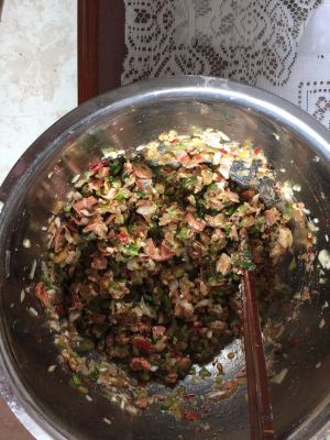 把葱切成葱花,放入辣椒粉,盐,五香粉,火腿肠丁,以及油。