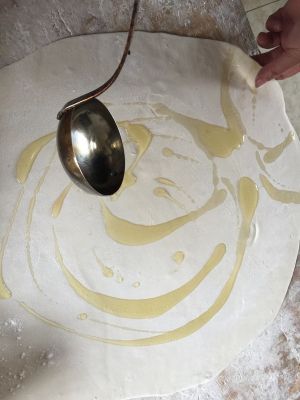 在面皮中放入一点色拉油,然后用面皮对折的形式把油摊均匀
