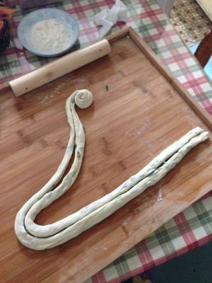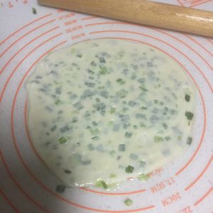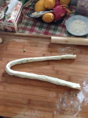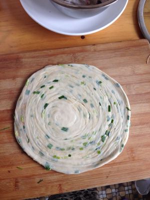 取三分之一面团。擀成长条状,均匀地抹上油酥,撒上葱花。