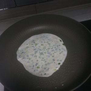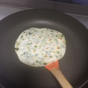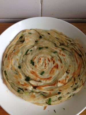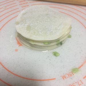 不粘锅少量油,煎几分钟,再反面煎几分钟,同时用筷子从两边往中间夹几下、一层层效果就出来了,轻轻夹不要太重,