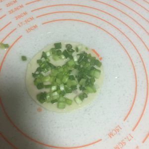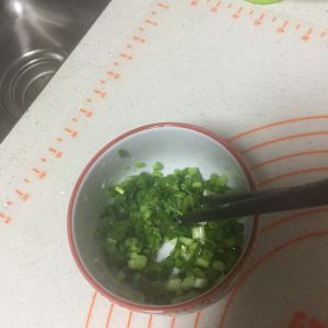 制作油酥。锅内起热油,投入葱白,至葱炸干捞出,取一小碗,放入适量面粉和盐,将热油倒入搅拌。葱切花备用。