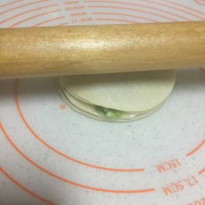 将擀好成饼的饺子皮放入加油的热锅中慢煎