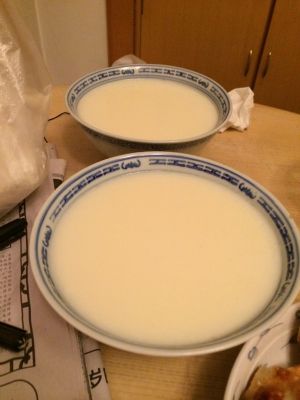 两个蛋清,两勺糖,挤入柠檬汁(不然会腥) 将奶皮边缘划破,倒出大部分的牛奶与此混合(奶皮仍留在碗里),“充分”搅拌均匀,过筛子一次去沫