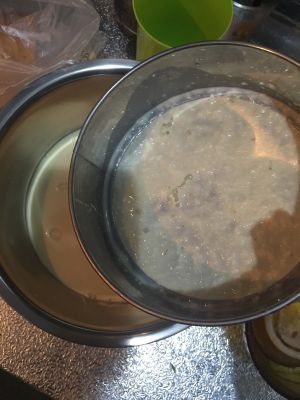 制作蛋挞液。烤箱此时可预热200摄氏度。 鸡蛋,牛奶,淡奶油,1-2勺海盐焦糖酱,混合搅拌均匀,不要用力过猛产生过多泡沫哦!过滤一下蛋液,去掉多余的蛋膜。