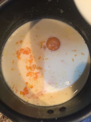 把蛋黄、白糖、牛奶、淡奶油打匀制成挞水。