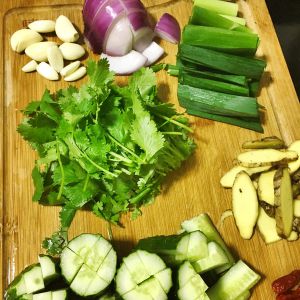除葱白其余材料都先下一半,剩下的等快好的时候再放。