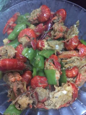 加油入小龙虾爆炒2分钟,加料酒,生抽,少许糖,加入龙虾黄,水煮3分钟,最后加青椒,3分钟后起锅。