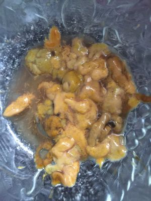头部剪掉尖处然后纵向剪开,扒开壳取黄备用。
