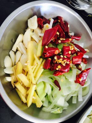 切好配料 葱姜蒜 干红辣椒 花椒 倒油爆香
