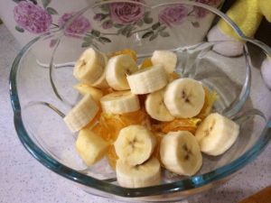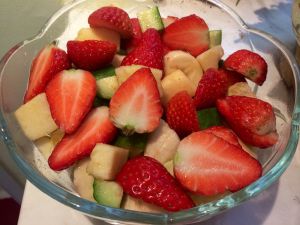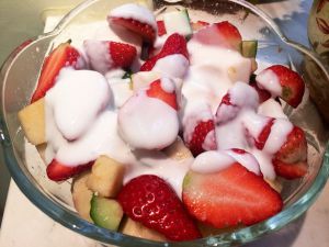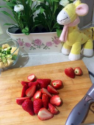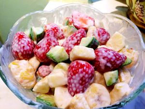 与生菜、水果放一起,浇色拉酱即可。水果我用的蓝莓。建议不要使用含水份过大的水果如橙子,和本身就没什么味道的水果如杨桃。