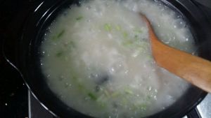 大约等到粥剩下20分钟时,加入瘦肉和皮蛋,搅拌一会,在加入盐2小勺,味精2小勺,糖半小勺,麻油2ml,葱花,搅拌后继续煮完20分钟就完成了。