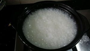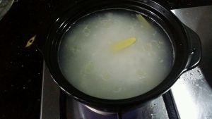 滚水倒入砂煲中,倒入米饭,放姜片,滴2滴花生油,拌匀。大火煮滚,中小火慢煲。