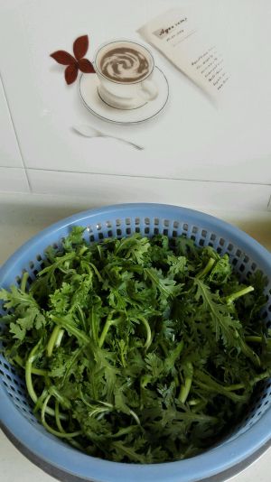 将茼蒿去根摘洗干净。
