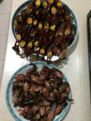 两大盘。大点的龙虾保留了虾黄。不过有人建议不要吃虾黄,也可去除。