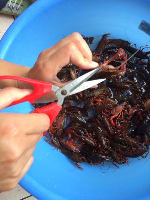先把小龙虾给它一个澡,用新的刷子刷干净,再剪掉虾头去除内脏,尾巴处抽出虾线,再把背部剪开,用清水给它洗个五六遍!