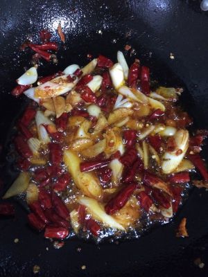锅里留油,放豆瓣酱,干辣椒,花椒,葱姜蒜爆香。还放了少许做小龙虾的料包,没有也没关系。