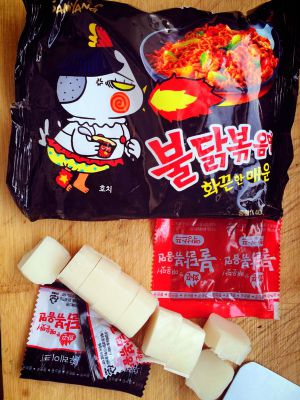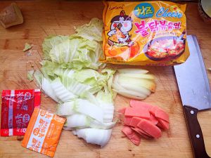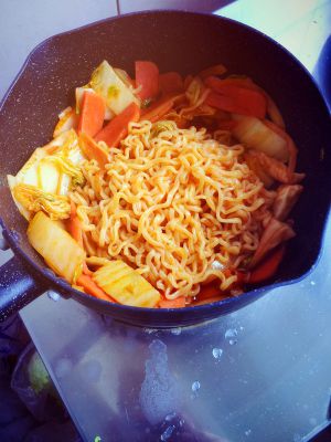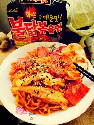 煮面的时候放年糕一起煮然后炒起来 完全就是辣年糕拉面 好吃