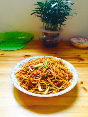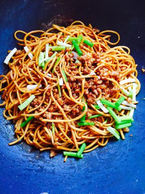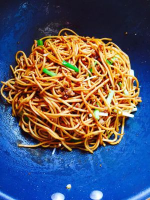 面条大火翻炒1分钟,放入备用一旁的肉末、葱段,翻炒十秒。