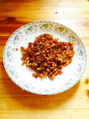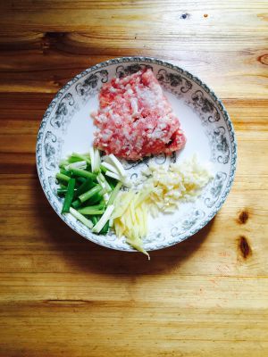 五花肉剁肉泥,大蒜子切蒜米,姜切丝,葱切段。