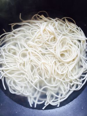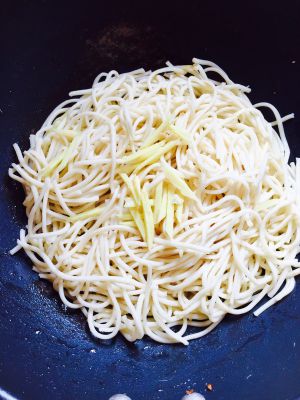 7、捞出肉末后,放入姜丝、沥干水分的面条。