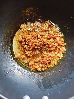蒜米炒至香,放入适量酱油让肉末上色,入味。
