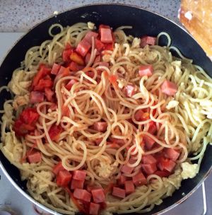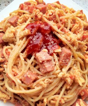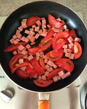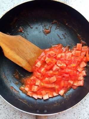 火腿丁和番茄翻炒小火(不放油),撒少许盐和一丁点辣椒粉。