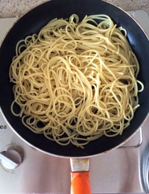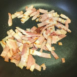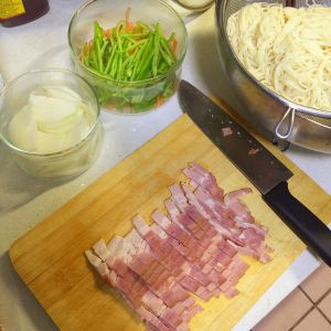 切一些培根 或者喜欢的火腿都可以。面条已经煮过了 放在一旁控水。