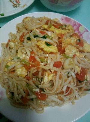 放油炒西红柿,加入鸡蛋,与面条,大火翻炒。