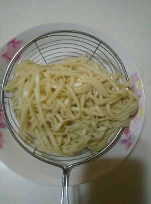 面条煮好,过凉开水,这很重要,这样面条劲道,然后沥水。