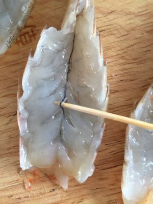 将虾洗净,然后一个个延虾背开刀处理好,将虾线取出。