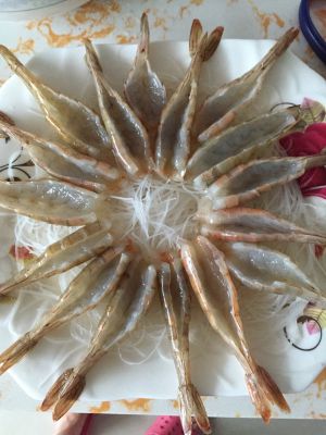 粉丝提前用凉水泡发30分钟,用剪刀剪成两段,铺在盘底,开背虾平铺在粉丝表面