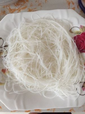3.粉丝用温水泡软,放入生抽,盐搅拌均匀,铺在盘子上