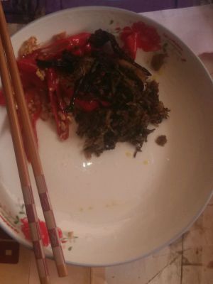 在放辣椒和鸡纵酱炒香,在把面条放入锅里,加点酱油和少许的醋盐,鸡精,就可以了是不是很简单